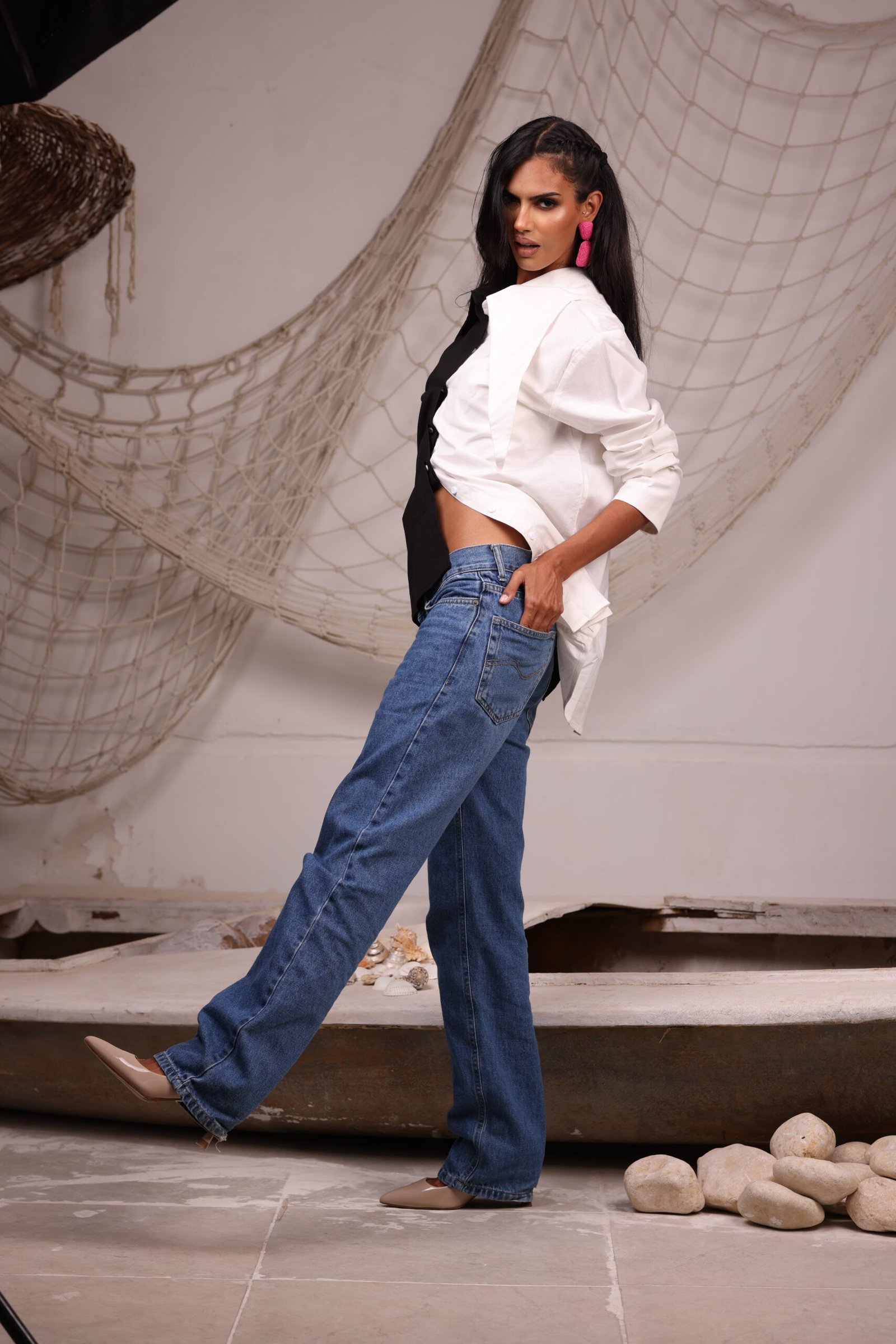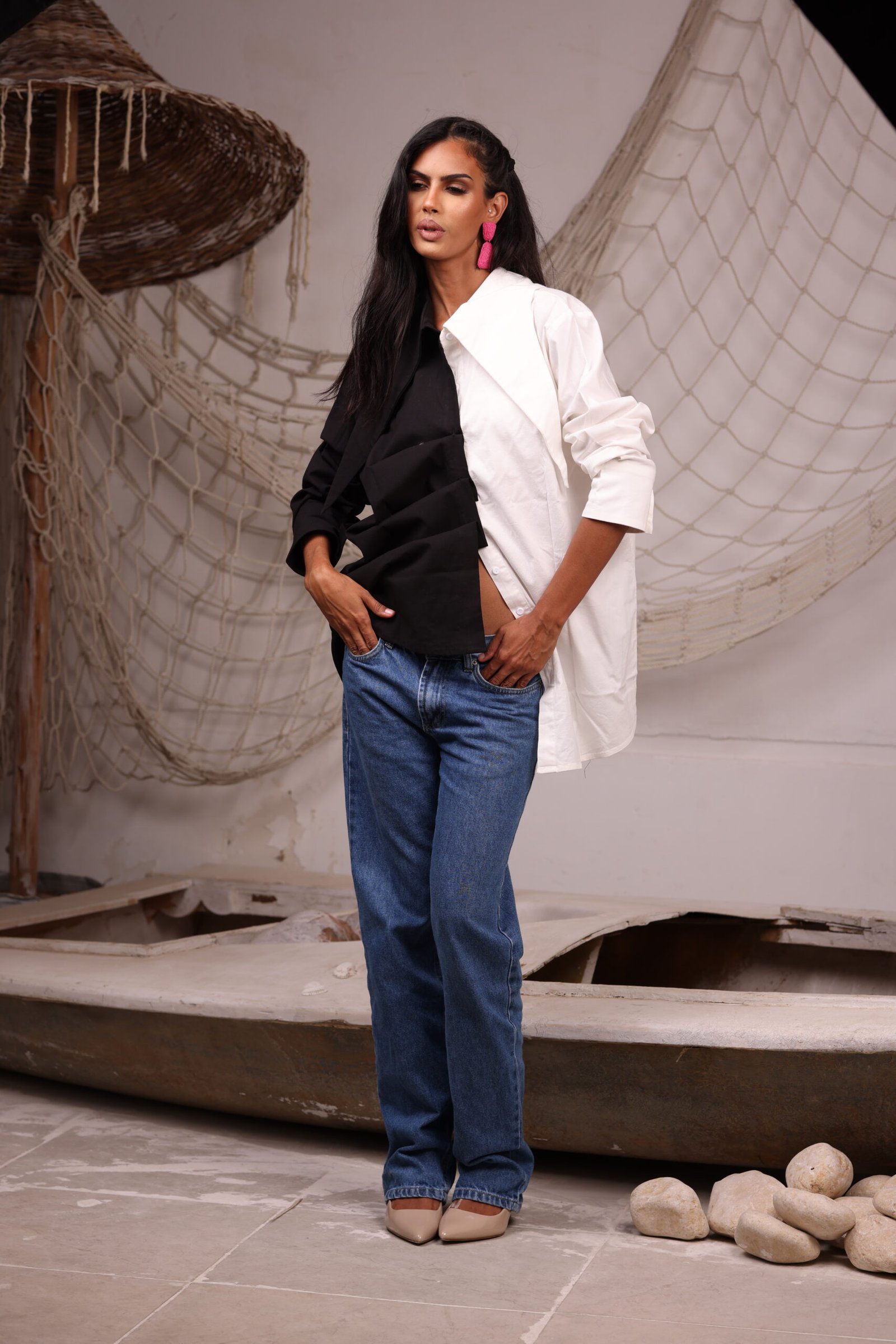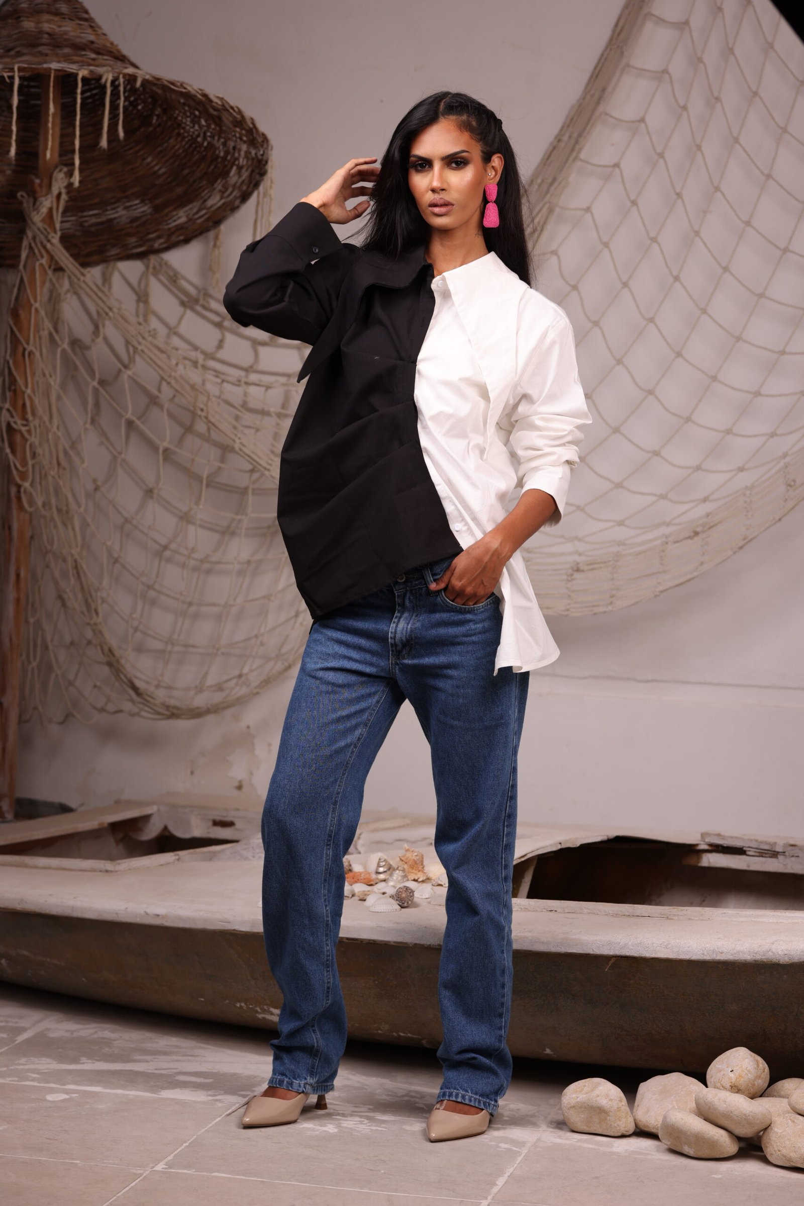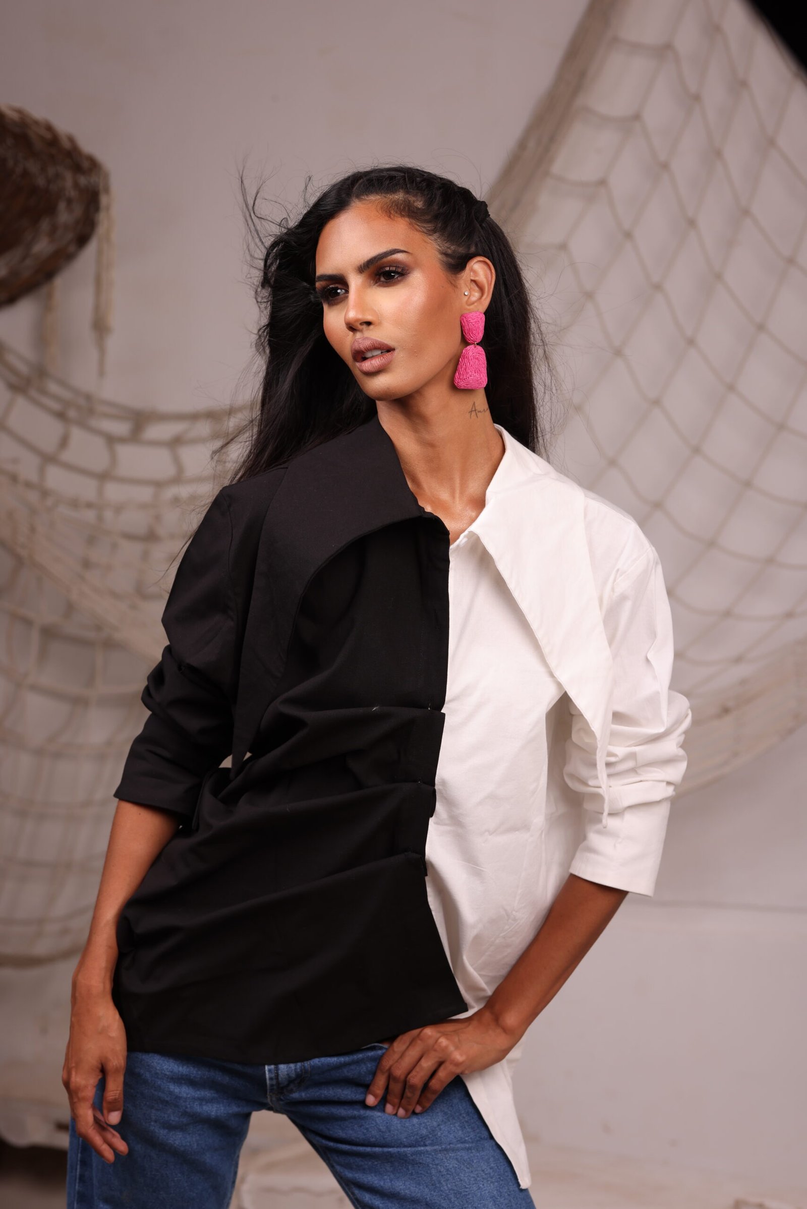 A striking black-and-white asymmetrical shirt styled with classic denim. Finished with bold pink earrings and pointed heels, this look captures confident minimalism with a fashion-forward twist.